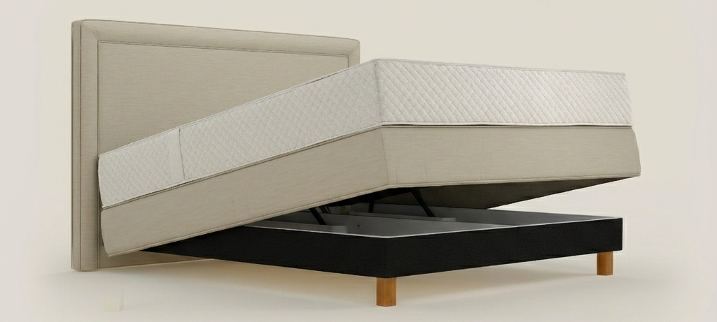- Box-Korpus mit integrierten Federkernen & unsichtbarem Bettkasten, welcher mittels Gasdruckzylindern angehoben werden kann.