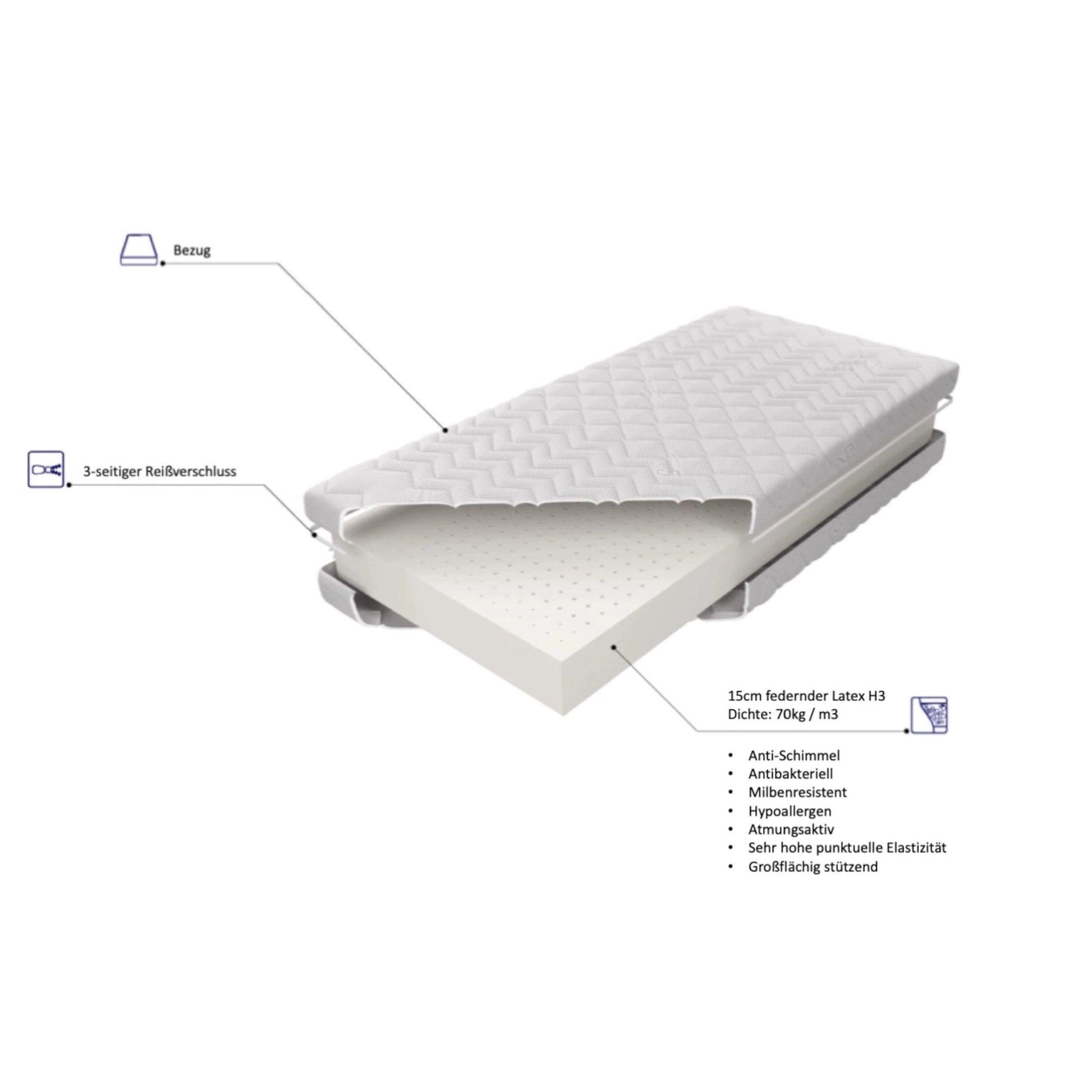 Eine 15 cm starke und federnde Latexschicht (H3), passt sich geschmeidig Ihren Körperkonturen an und unterstützt Ihre Wirbelsäule stabil und ergonomisch.