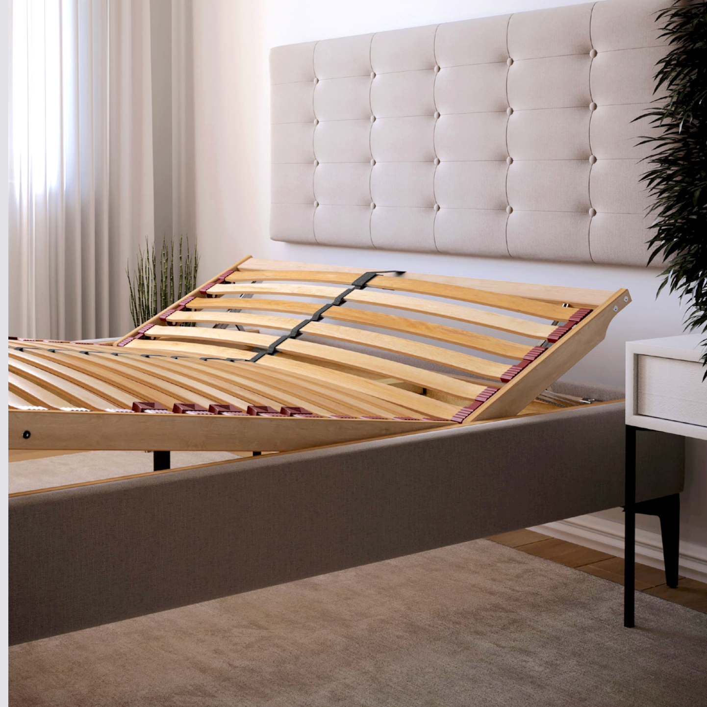 Der Rahmen besteht aus mehrschichtig verleimtem Birkenholz & ist mit 28 elastischen Brikenholzleisten ausgestattet, die in flexiblen Halterungen gelagert sind. Ein verstärkender Mittelgurt sorgt für eine gleichmäßige Druckverteilung, während die individuell einstellbare Mittelzone zusätzlichen Komfort ermöglicht.