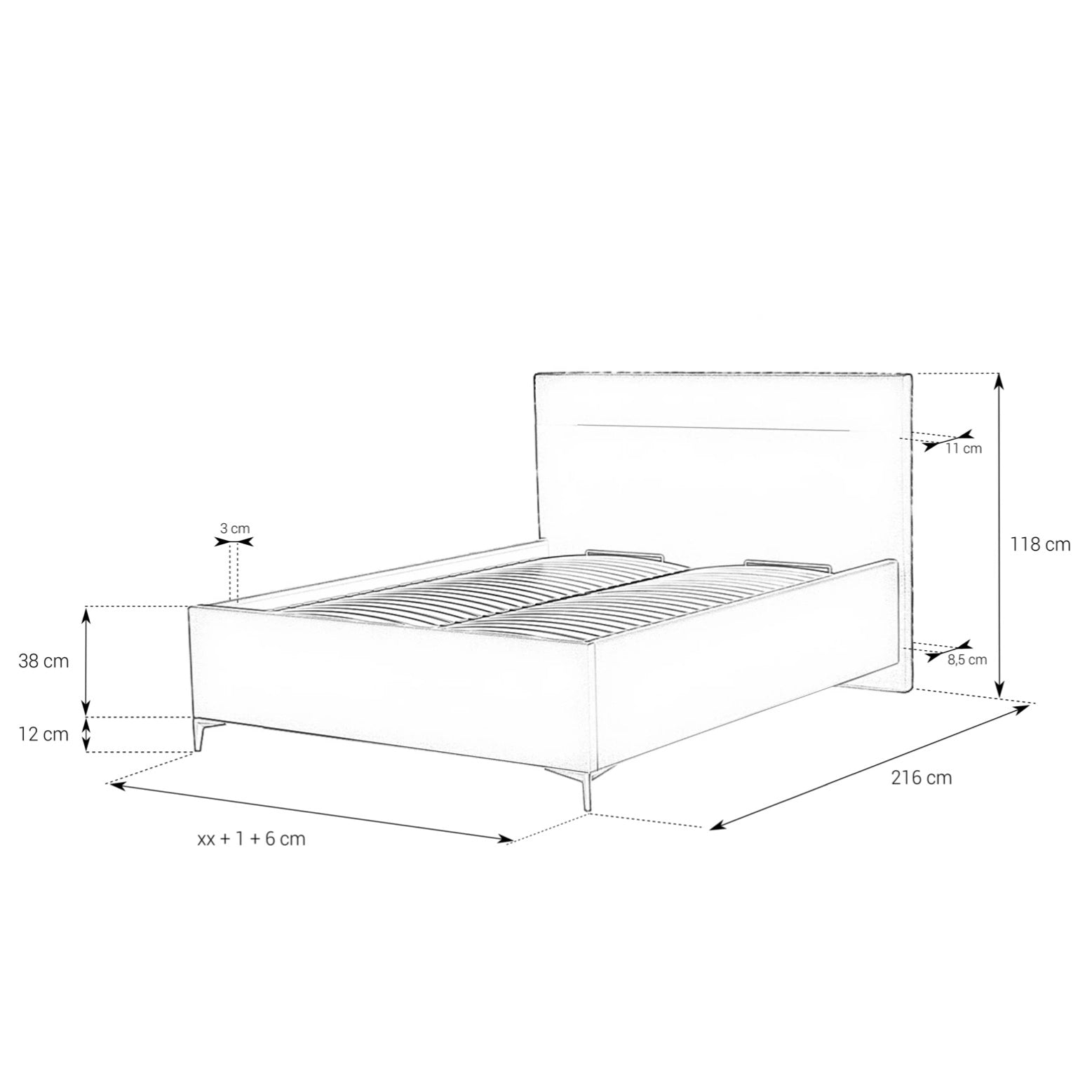 - Gesamtbreite Bettrahmen: Matratzenbreite + 6cm